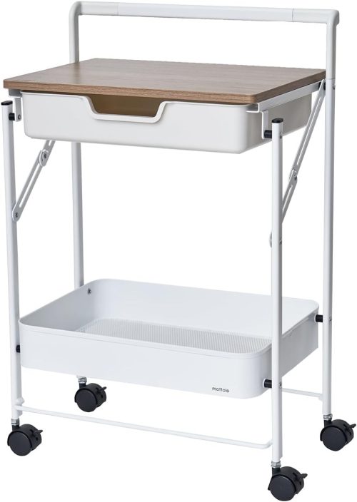360°回転するストッパー付きキャスターを4つ搭載。天板の耐荷重は約10kg、引き出しは約3kgで収納力も十分。使わないときは折りたたんで省スペース収納が可能なため、限られたスペースを有効活用したい方におすすめです。