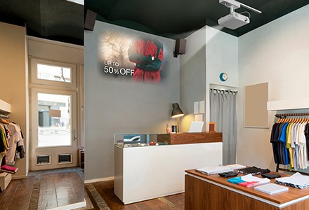専用ソフトウェアを使用してスタンドアロン投写できるのがおすすめのポイント。映像のプレイリストを流すことで、店舗の空間演出にも活用できます。