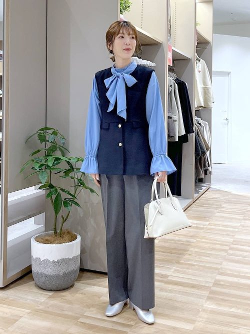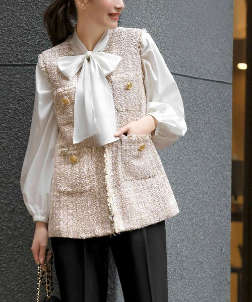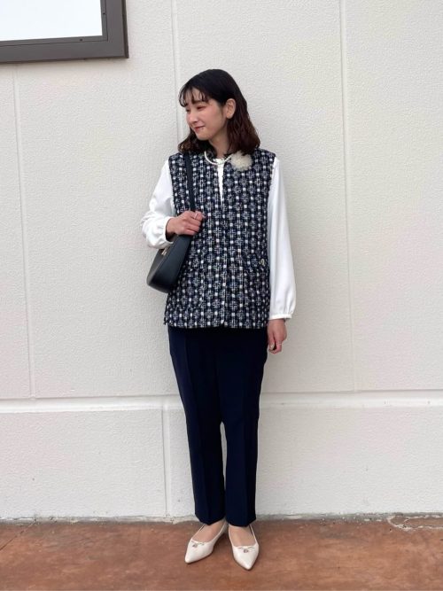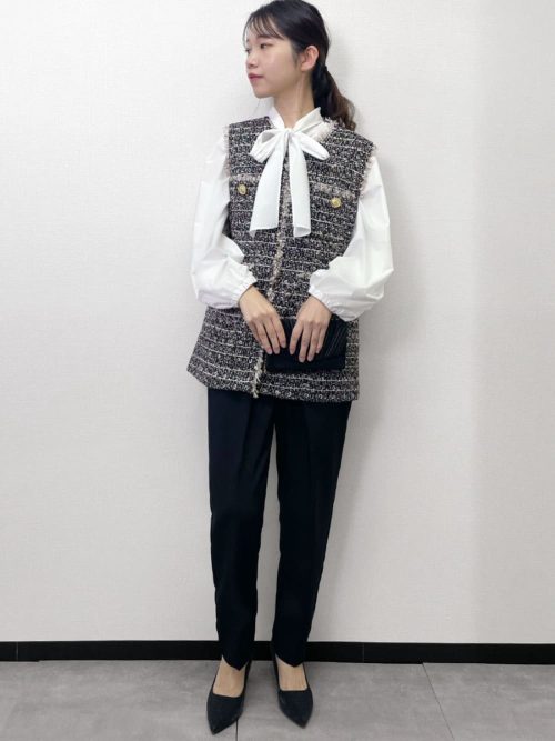 ボウタイブラウス×ツイードベストで華やかに
