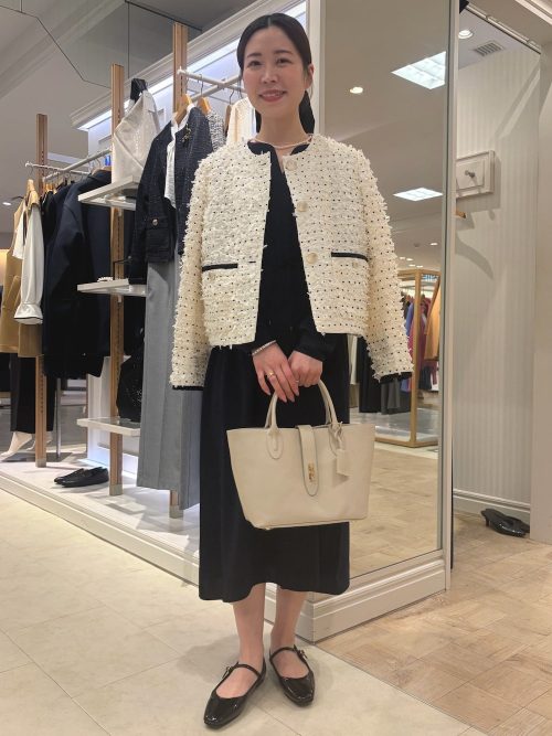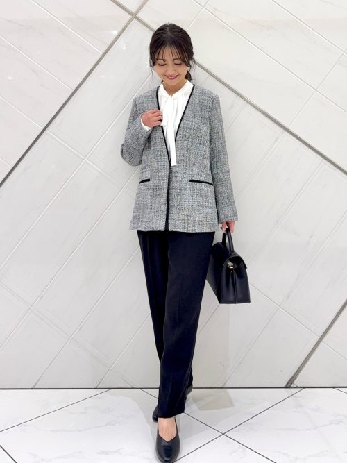 ツイードジャケットに黒のテーパードパンツをあわせた、セレモニー向けのきれいめスタイルです。ノーカラージャケットに施された黒のパイピングがアクセントになり、全体をすっきりと引き締めています。