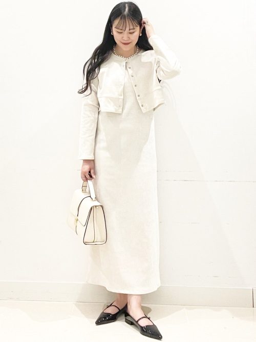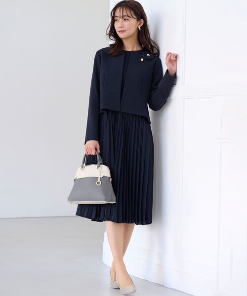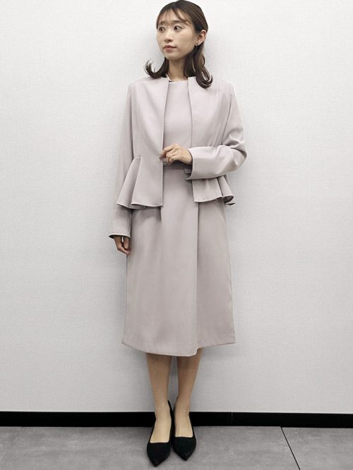 淡いニュアンスカラーが春らしい、上品なセットアップスタイルです。ふわりと広がるペプラムデザインのノーカラージャケットがフェミニンな印象をプラス。同色のワンピースをあわせて、洗練されたフォーマルな装いに仕上げています。