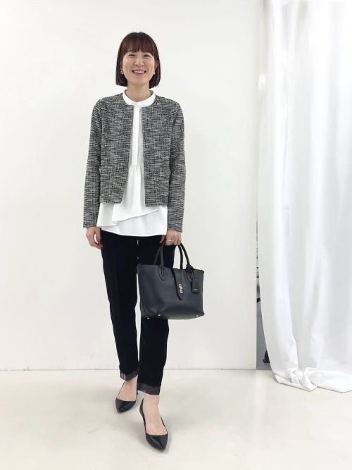 ツイード素材のノーカラージャケットを主役にした、上品なモノトーンコカジノ バカラ 英語です。ボトムスには黒のテーパードパンツをあわせ、すっきりとしたシルエットを演出。白のバンドカラーブラウスが清潔感を与えています。
