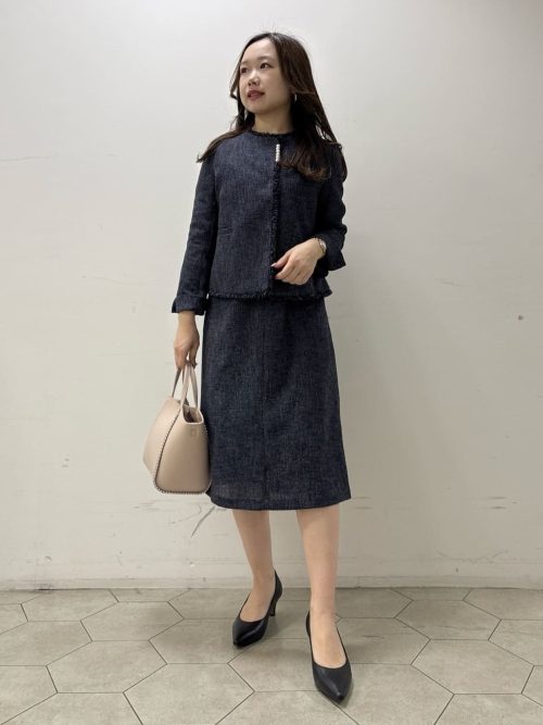 上品なネイビーのツイード生地を使用したセットアップコカジノ バカラ 英語。ノーカラージャケットは縁取りのフリンジデザインが特徴的で、程よく華やかさを演出できます。胸元のパール装飾がアクセントになり、ネックレスなしでも顔まわりが明るく見えるのが嬉しいポイントです。