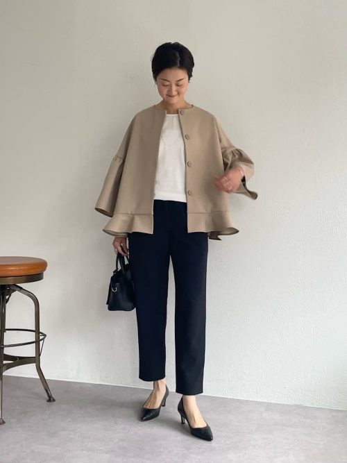 黒のノーカラージャケットとテーパードパンツをあわせたオケージョンスタイルです。ジャケットはウエストから広がるペプラムシルエットを選び、女性らしさを演出。白インナーのフリルネックや袖口を効果的に見せて、軽やかさを加えています。