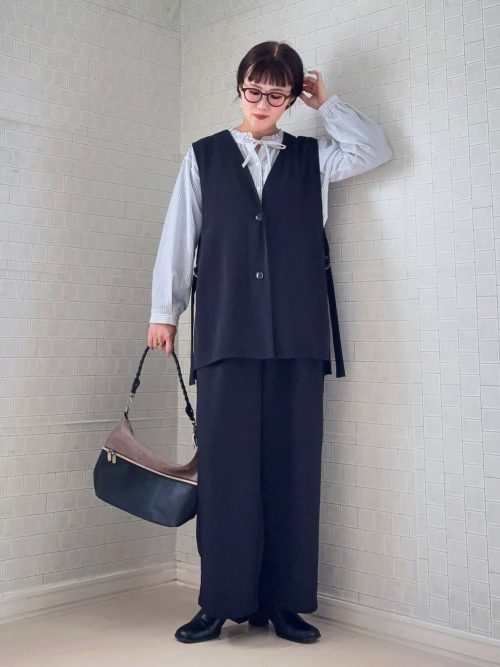 全体的に程よくゆったりとしたシルエットで、体型カバーも期待できるスタイリング。サイドのリボンデザインがさりげなく大人かわいい雰囲気を演出しています。バイカラーのバッグや眼鏡をアクセントに加え、知的な印象にまとめているのもおしゃれです。