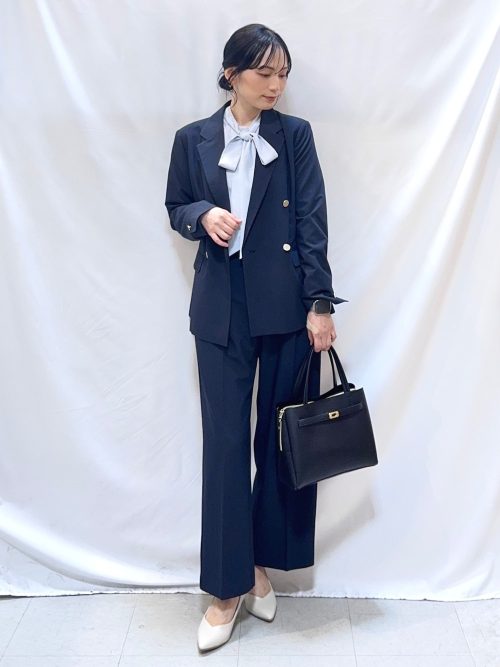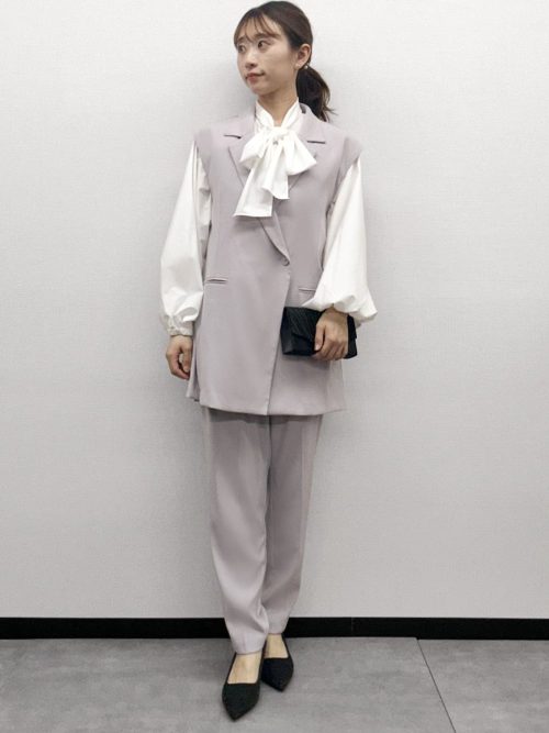 ジャケットのウエストリボンを結ぶことで、メリハリのあるシルエットを演出。足元は黒のシューズで淡いトーンを引き締め、落ち着いた雰囲気をプラスしています。フォーマルな場にもなじむ、上品なパンツスタイルです。