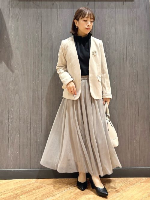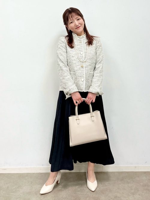 小物はベージュ系のハンドバッグとパンプスで統一し、洗練されたワントーンスタイルを構築。光沢感のあるスカートが動くたびに揺れ、女性らしいエレガントな雰囲気を高めています。ハレの日にぴったりの着こなしです。