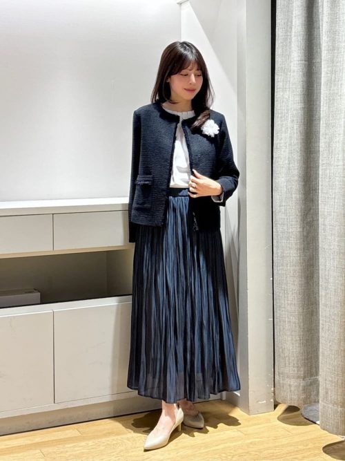 ジャケットの胸元にはパールのついたコサージュをプラス。パンプスはセットアップにあわせてダークカラーを選び、統一感のある着こなしに仕上げています。ハレの日にふさわしい、清楚で落ち着いた印象の正統派スタイルです。