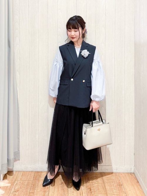 インナーには白のボウタイブラウスを選び、顔まわりを明るく華やかに演出。小物を黒で統一して、フォーマルな場面にふさわしい落ち着きを加えています。品よく決まる大人のママコカジノ バカラ 英語です。