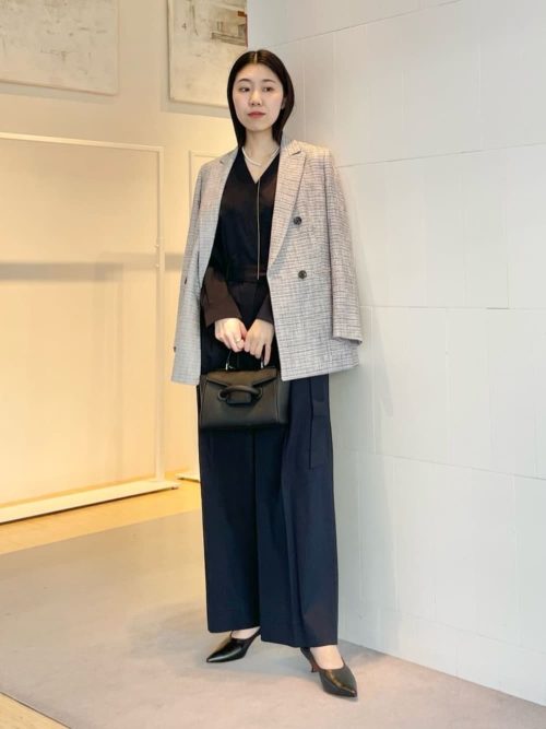 インナーにはサテン地のブラウス、ボトムスにはセンタープレスの入ったワイドパンツを選択。きれいめながら動きやすさも確保しています。ショート丈のジャケットとの組み合わせで、腰の位置が高く見えてスタイルアップが叶うのもポイント。足元はVカットのパンプスですっきりと仕上げた、ハレの日にぴったりのクールな装いです。