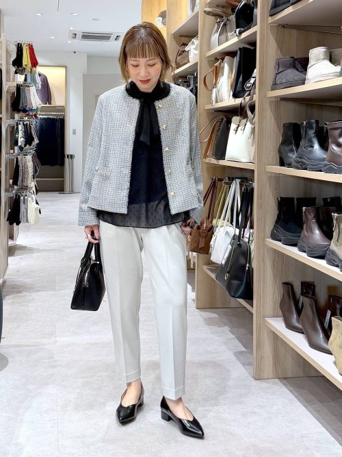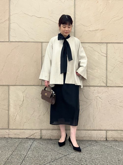 首元の細いリボンがアクセントになり、顔まわりを明るく見せてくれます。小物はツイード素材のハンドバッグと黒のパンプスでまとめ、シックな雰囲気に。きちんと感とレディ感を好バランスにまとめたおすすめのカジノ バカラ 英語スタイルです。