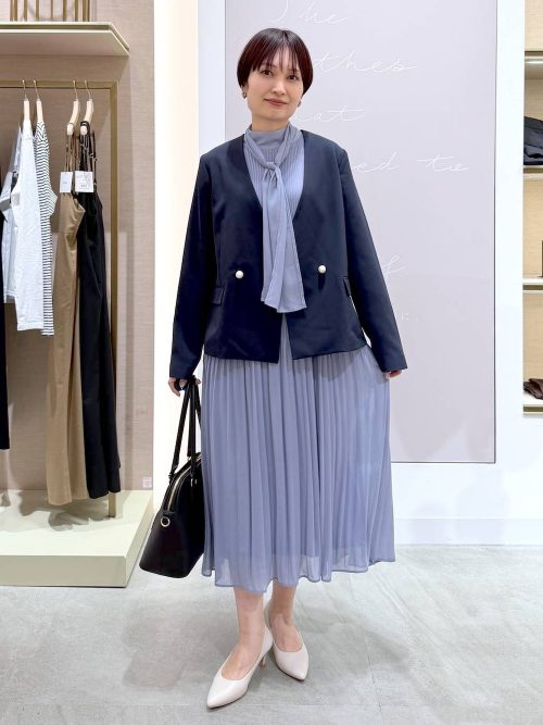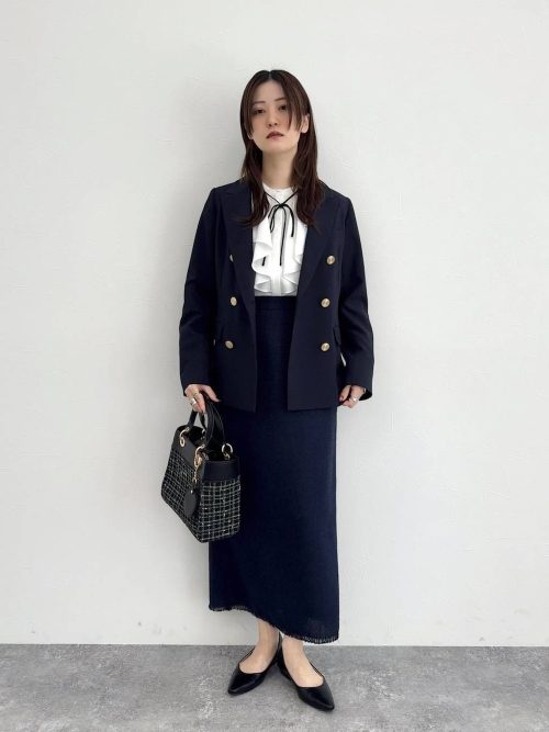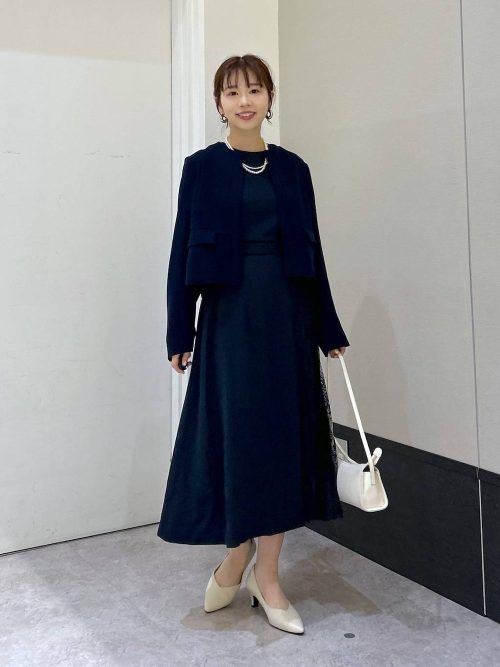 ネイビーのノーカラージャケットに、ライトブルーのワンピースをあわせた上品な装いです。ジャケットのパールボタンがクラシカルなアクセントになり、フォーマルな場面にふさわしいきちんと感を演出。寒色系でまとめた、清潔感あふれる着こなしです。