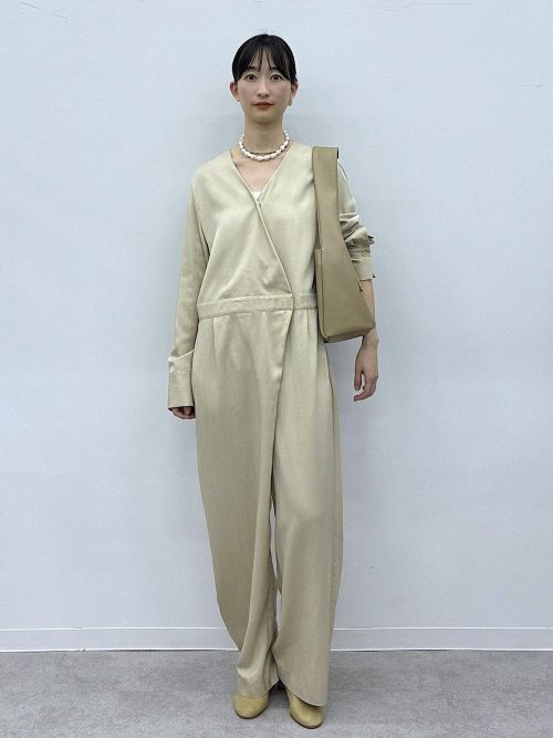 上品なベージュのオールインワンを主役にした、洗練されたきれいめスタイルです。ラップ風デザインでこなれ感を演出。深めのVネックにより顔まわりをすっきりと見せているのがポイントです。首元にはパールネックレスを飾り、ハレの日にふさわしい華やかさをプラスしています。