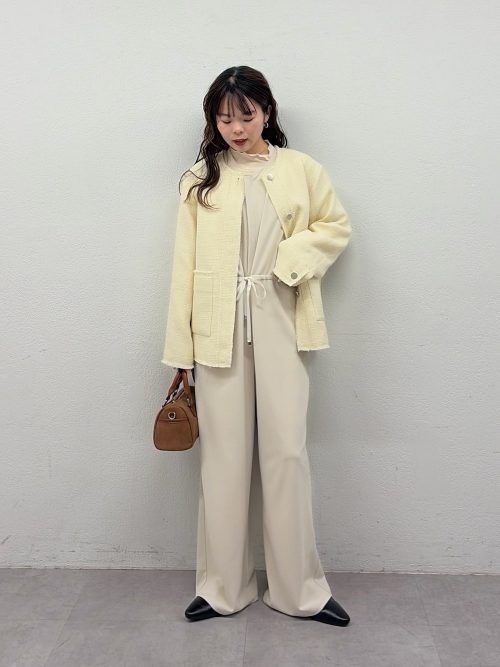 パステルイエローのノーカラージャケットが春らしさを演出するセレモニースタイルです。インナーにはベージュのオールインワンをあわせて、明るくやわらかな雰囲気にまとめています。ウエストのドローストリングによりメリハリをプラスしているうえ、ワイドパンツのシルエットで動きやすさも確保。シアーリブTを中にインして、首元からフリルを覗かせているのもかわいらしいポイントです。