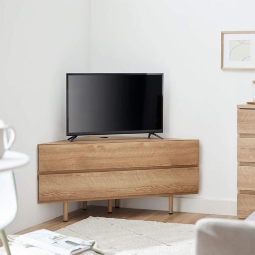 開き扉と可動棚を備えた収納スペースで、DVDプレーヤーやゲーム機などの周辺機器をすっきりと整理できます。コードスリットとコード穴が設けられており、配線をスマートに処理できるのも魅力。部屋の角にフィットするため、限られたスペースを効率よく使いたい方におすすめです。