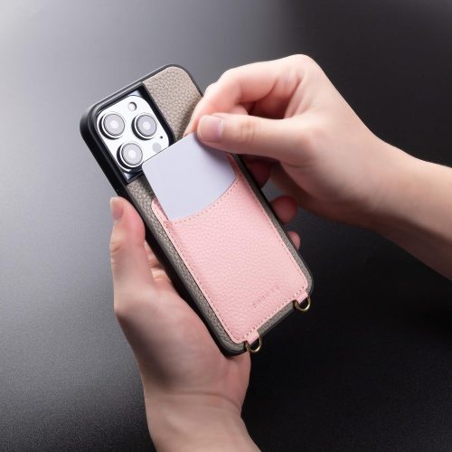 ケースの背面にスナップボタン式のカードポケットが付いており、カードを2枚まで収納可能。コバ部分に何重ものコーティングが施されたショルダーストラップは耐久性が高く、長く使い続けられるのもポイントです。
