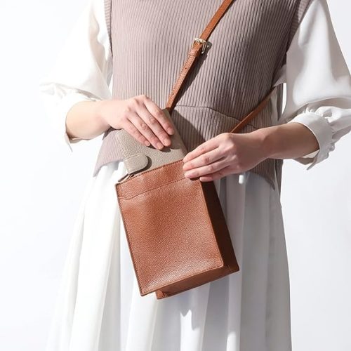 くすみカラーのバリエーションを展開しており、洗練された雰囲気のデザインが魅力。ショルダーストラップは取り外しが可能で、斜め掛けや肩掛け、首掛けなどシーンに応じて使い分けられます。レザー調の素材を使用しており、手触りも良好です。