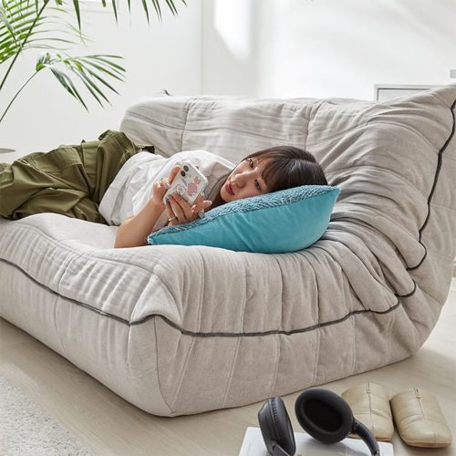 程よいやわらかさの座り心地で、アームレスなので寝転がっても窮屈に感じにくいと好評。生地のざらつきによってずり落ちにくく、背もたれを枕代わりにしてくつろぐこともできます。