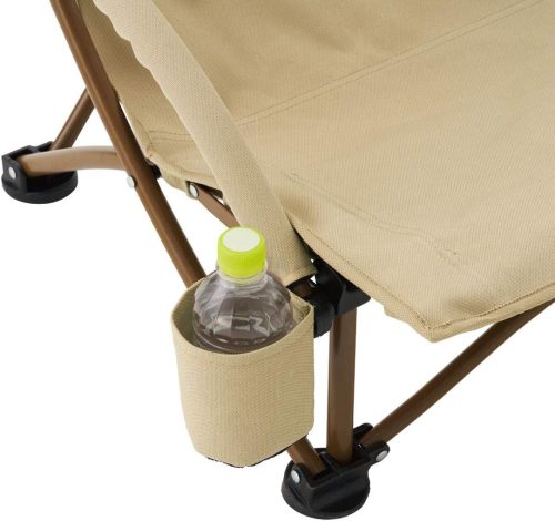 フレームに頑丈なスチールを採用しており、耐荷重約120kgと安定感も良好。ドリンクホルダーが付属し、手元に飲み物を置けるのもメリットです。ゆったり座れるワイドサイズながら、収束式のため約縦14×横76×高さ20cmとコンパクトに収納可能。収納バッグはベルト付きなので、持ち運びも容易です。