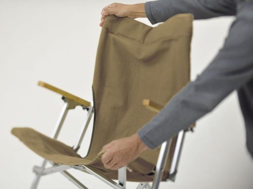 背もたれは左右のアームレストを持ち上げて、座ったまま3段階でリクライニングが可能。座面は低く設計されており、足を投げ出して楽な姿勢でくつろげるのが魅力です。背面には収納に便利なポケットが付属。使用後はコンパクトに折りたたみできるので、携帯性も良好です。