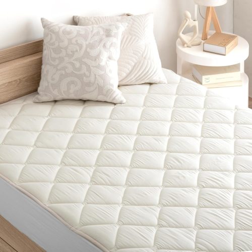 四隅にゴムバンド付きでマットレスや布団にしっかり固定でき、寝返りを打ってもズレにくい設計。洗濯機で丸洗いできるため、清潔に保てます。
