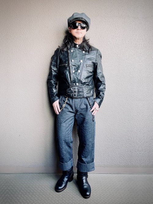 デニムの裾をロールアップし、ブーツの存在感を引き立たせています。ミリタリーやレザーアイテムを組み合わせた秋冬におすすめの着こなしです。