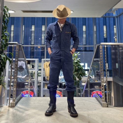 足元は重厚感のある黒のカジノ バカラ 種類ジニアブーツをセレクト。ツナギの裾をブーツインして、すっきりとしたシルエットに仕上げています。ベージュのハットがアメカジコーデのアクセントとなる、おすすめの着こなしです。