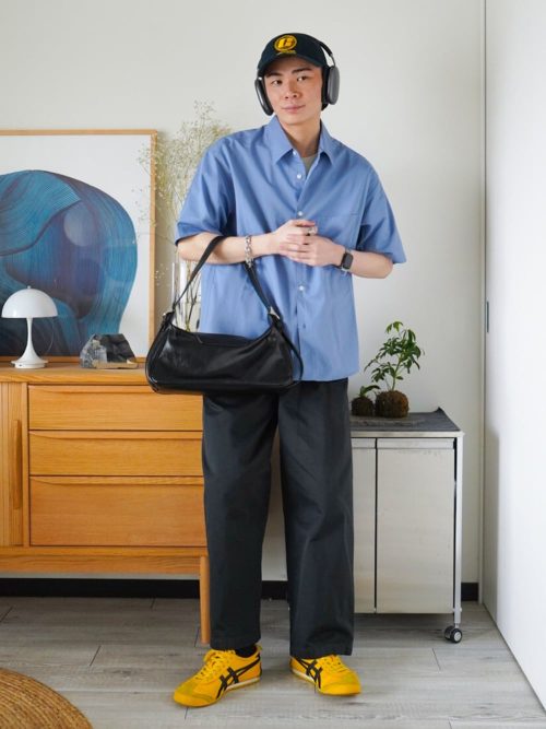 爽やかなブルーの半袖シャツに黒のワイドパンツをあわせた、夏らしいリラックスコーデです。足元には鮮やかなイエローのスニーカーをセレクト。シンプルなボトムスのなかに、目を引くアクセントをプラスします。
