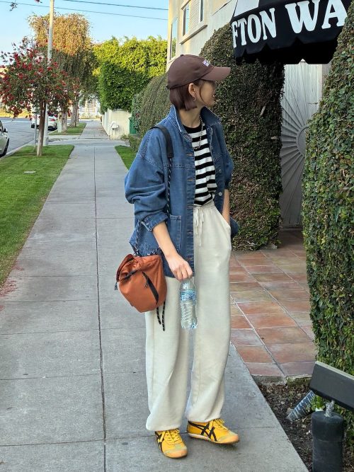 オーバーサイズのデニムジャケットとボーダーTシャツで作るカジュアルスタイル。ボトムスはオフホワイトのスウェットパンツを選んで抜け感を演出しています。ゆったりシルエットが魅力的な着こなしです。