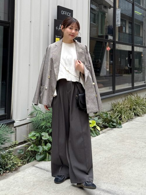 グレーのジャケットに同系色のワイドパンツをあわせた大人カジュアルコーデです。金ボタンつきのジャケットを肩掛けし、こなれ感を演出。白のトップスで、程よく明るさをプラスしています。