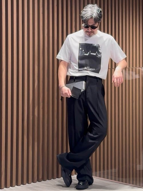 フォトプリントTシャツを主役にした、大人のモノトーンコーデです。ボトムスには立体感が美しい黒のワイドパンツを合わせ、リラックス感がありながらもモードな雰囲気を演出しています。