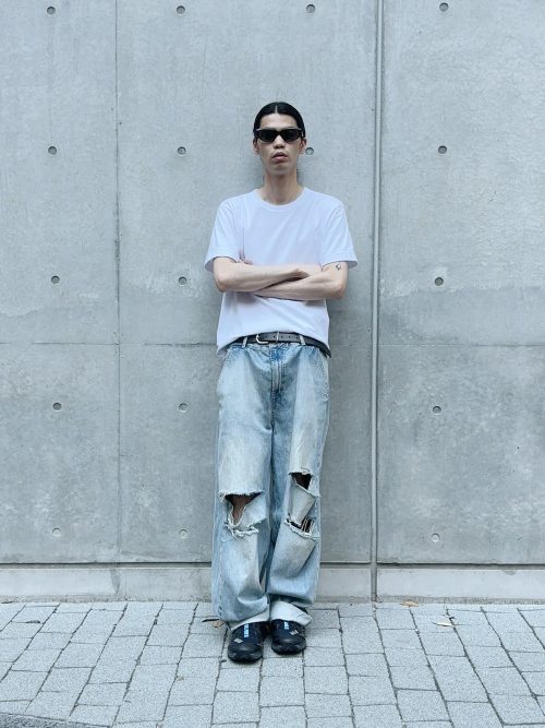 白の無地Tシャツに、ハードなダメージ加工が施されたワイドデニムを合わせたストリートコーデです。トップスはスタンダードなサイズ感を選び、ボトムスにボリュームを持たせてシルエットに変化をつけています。