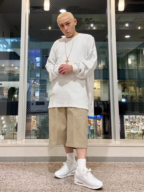 オーバーサイズの白ロンTに、ベージュのハーフパンツを合わせたストリートコーデです。上下ともにルーズなシルエットを選び、リラックス感のある雰囲気を演出しています。