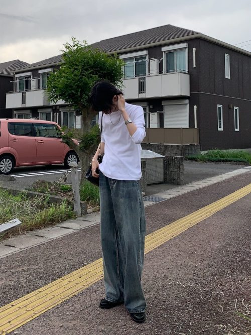 シンプルな白の長袖Tシャツに、ワイドシルエットのデニムパンツを合わせたカジュアルコーデです。全体的にゆったりとしたサイズ感でまとめています。色落ち加工が施されたデニムが、ヴィンテージライクな表情を見せています。
