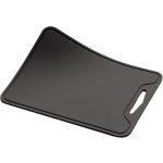 シリコーン製で曲げられるフレキシブルまな板。カラーは食材が見やすいダークグレーを採用しており、切った食材の色がひと目で確認できる仕様です。シリコーン素材ならではの適度なしなやかさが、まな板のずれを防ぎます。