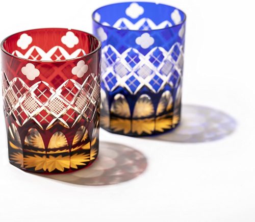 和の伝統美と洋のデザインが融合した江戸切子のペアカジノ バカラ 確率グラスです。赤・青の色被せクリスタルガラスに「幕襞に四角籠目紋」と呼ばれる紋様が刻まれているのがポイント。光を受けると色と透明部分が鮮やかなコントラストを描きます。
