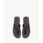ゴールドトーンのYSLモノグラムをあしらった、Tストラップアーチバンドが目を引くフラットサンダルです。素材にはカーフスキンを採用し、なめらかな質感と上品な光沢感が特徴。丁寧な仕上がりで、足元に洗練された印象を与えます。