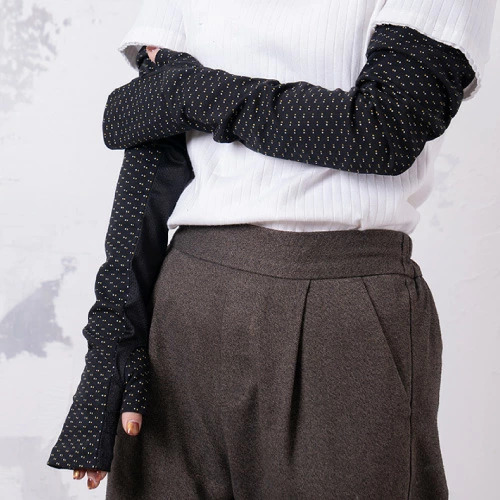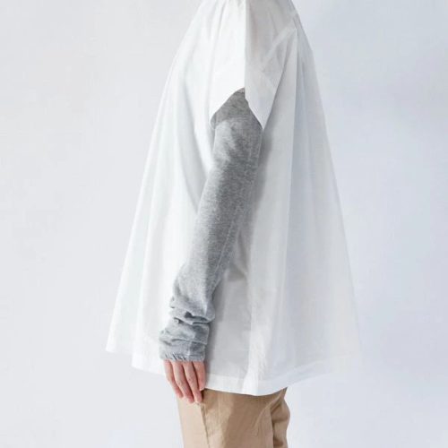 手の甲から二の腕までをカバーできるロングタイプ。少しクシュっとたるませて着用してもおしゃれです。指先が出るので、着用したままさまざまな作業ができる点も便利。普段の服装にあわせやすいキナリ・グレー・グレーを展開しています。