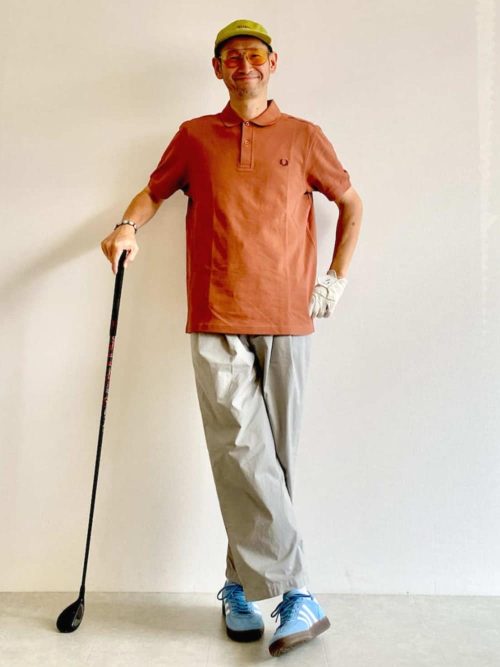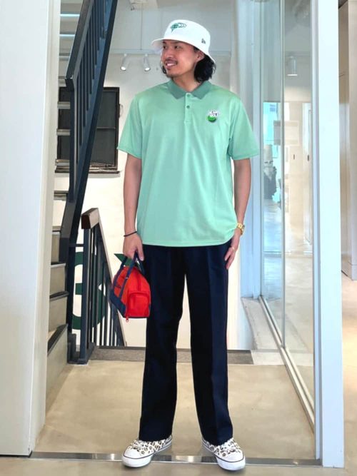 白のバケットハットで顔周りに涼しげな印象をプラス。足元には柄物スニーカーを選び、遊び心を加えています。赤いバッグが着こなしを引き立てる、おしゃれなカジノ バカラ 種類ゴルフウェアスタイルです。
