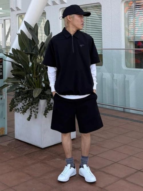 黒を基調とした、シックな印象のカジノ バカラ 種類ゴルフスタイル。トップスに黒の半袖ハーフジップシャツを選び、同色のショーツを合わせています。キャップも黒で統一しており、まとまりのある落ち着いた雰囲気です。