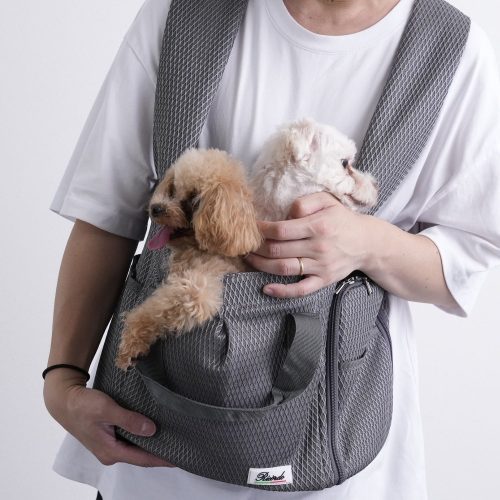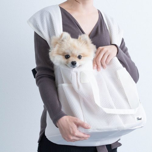 愛犬を優しく包み込む、通気性のよい抱っこスリング。本体には軽量で柔らかなポリエステルメッシュ素材を採用しています。特に気温の高い季節におすすめです。