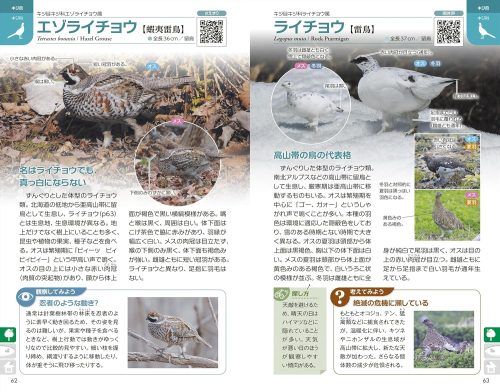 1ページ1種の構成を採用し、大きな写真で羽色・形態・雌雄差などを視覚的に確認できます。生息地や食性といった生態情報に加え、種ごとに「探すためのヒント」も記載。フィールドで実際に使いやすいのが魅力です。