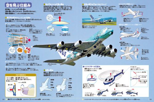 鉄道では新幹線や観光列車、通勤電車まで幅広く掲載。自動車は消防車・工事車両を機能別に分類し、飛行機は旅客機から自衛隊機まで収録しています。