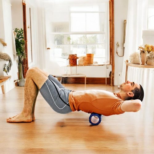肩甲骨周りをほぐしたいときは、ローラーを肩甲骨の下部や上部に当たるようセットして、しばらくキープします。両手を頭の後ろで組み、肘を天井に向けてお尻を浮かせると、肩甲骨の内側にもアプローチできて便利です。また、縦置きにして背骨の両側を左右に揺らす方法も試してみてください。