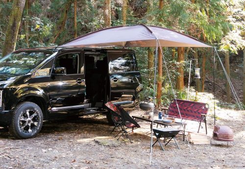 リアゲートを跳ね上げた状態でタープを展開すれば、開放感のあるリビングを作れます。車中泊やオートキャンプでの日よけ・雨よけとして活躍。アウトドアをよりスマートに楽しみたい方にぴったりです。
