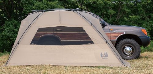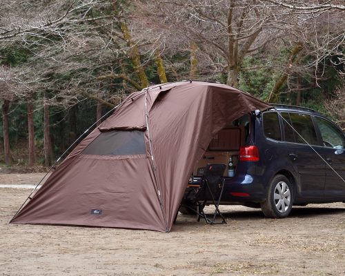ポール・フレームと車体固定を組み合わせた構造により、比較的風に強いのが特徴です。設営に手間がかかる場合もありますが、安定感のあるリビングのような空間を作れます。キャンプ場で落ち着いて過ごしたい方に適したタイプです。