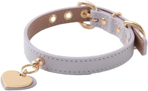 揺れるメタルチャームとハート型レザーチャームがおしゃれなアクセントに。愛犬の毛色に合わせて選べるカラー展開も魅力です。トイプードルやチワワなど小型犬にぴったりなモデルで、同素材のレザーリードと組み合わせて使用できます。