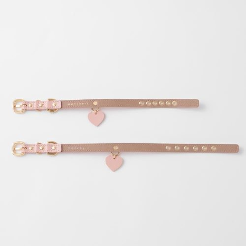 ハート型のバックルとチャームで愛犬の首元を華やかに演出するレザー首輪。牛革を表側に、合成皮革を裏側に配した2枚仕立てで、高級感のある仕上がりです。使い込むほどに革が馴染み、愛犬の首にフィットします。
