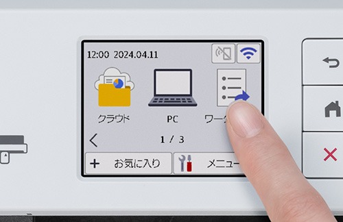 2.7インチのカラータッチパネルを採用しています。さまざまな操作が直感的にできるほか、メンテナンス方法が分かりやすく案内されるなど、使いやすさは良好。使用後はADFと排紙トレイを折りたたんでコンパクトに収納できるため、デスク周りで邪魔になりにくいのもポイントです。